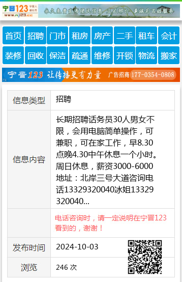 长期招聘话务员30人男女不限,会用电脑简单操作,可兼职,可在家工作,早8.30点晚4.30中午休息一个小时。周日休息,薪资3000-6000地址:北岸三号大道咨询电话13329320040冰姐13329320040 【电话咨询时,请一定说明在七台河信息网看到的,谢谢!】 |