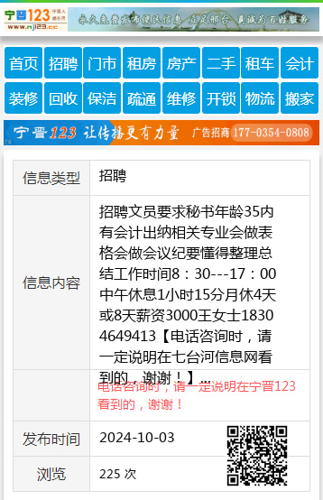 招聘文员要求秘书年龄35内有会计出纳相关专业会做表格会做会议纪要懂得整理总结工作时间8:30---17:00中午休息1小时15分月休4天或8天薪资3000王女士18304649413 【电话咨询时,请一定说明在七台河信息网看到的,谢谢!】 |