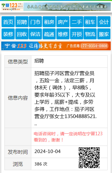 招聘茄子河区营业厅营业员,五险一金,法定三薪,月休8天(调休),早8晚5,要求年龄35以下,大专及以上学历,底薪+提成,多劳多得,工作地点:茄子河区营业厅张女士13504888521 【电话咨询时,请一定说明在七台河信息网看到的,谢谢!】 |