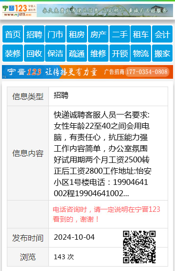 快递诚聘客服人员一名要求:女性年龄22至40之间会用电脑,有责任心,抗压能力强工作内容简单,办公室氛围好试用期两个月工资2500转正后工资2800工作地址:怡安小区1号楼电话:19904641002程19904641002 【电话咨询时,请一定说明在七台河信息网看到的,谢谢!】 |