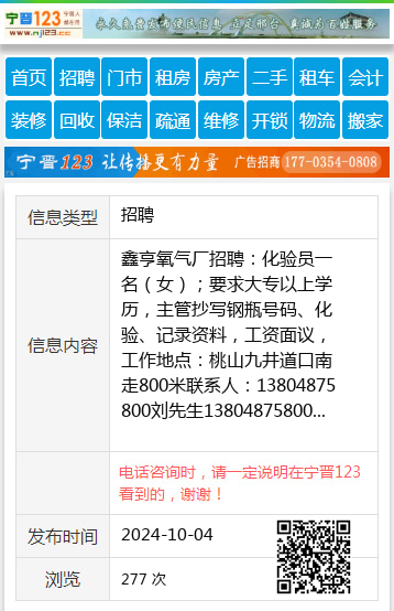鑫亨氧气厂招聘:化验员一名(女);要求大专以上学历,主管抄写钢瓶号码、化验、记录资料,工资面议,工作地点:桃山九井道口南走800米联系人:13804875800刘先生13804875800 【电话咨询时,请一定说明在七台河信息网看到的,谢谢!】 |