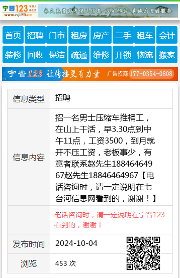 招一名男士压缩车推桶工,在山上干活,早3.30点到中午11点,工资3500,到月就开不压工资,老板事少,有意者联系赵先生18846464967赵先生18846464967 【电话咨询时,请一定说明在七台河信息网看到的,谢谢!】 |