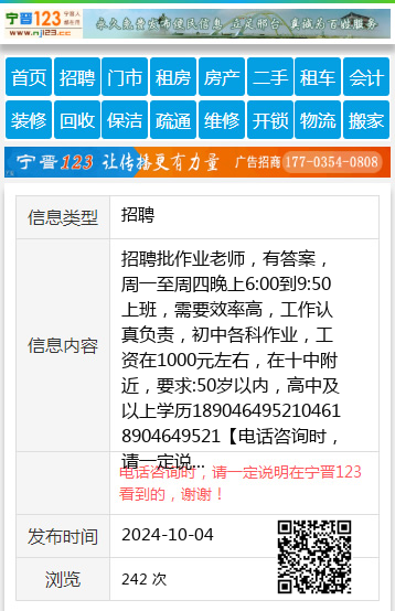 招聘批作业老师,有答案,周一至周四晚上6:00到9:50上班,需要效率高,工作认真负责,初中各科作业,工资在1000元左右,在十中附近,要求:50岁以内,高中及以上学历1890464952104618904649521 【电话咨询时,请一定说明在七台河信息网看到的,谢谢!】 |