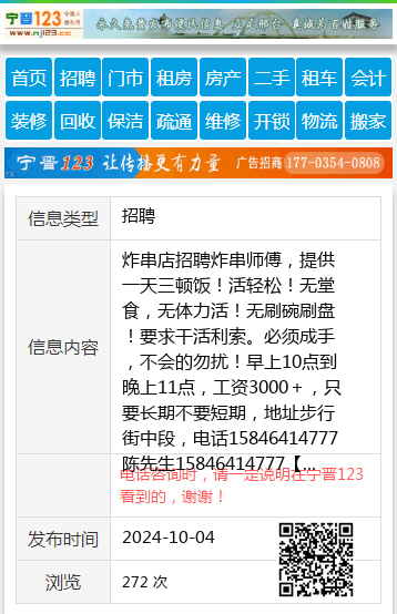 炸串店招聘炸串师傅,提供一天三顿饭!活轻松!无堂食,无体力活!无刷碗刷盘!要求干活利索。必须成手,不会的勿扰!早上10点到晚上11点,工资3000+,只要长期不要短期,地址步行街中段,电话15846414777陈先生15846414777 【电话咨询时,请一定说明在七台河信息网看到的,谢谢!】 |