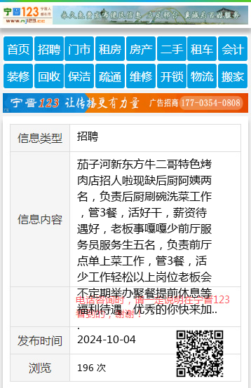 茄子河新东方牛二哥特色烤肉店招人啦现缺后厨阿姨两名,负责后厨刷碗洗菜工作,管3餐,活好干,薪资待遇好,老板事嘎嘎少前厅服务员服务生五名,负责前厅点单上菜工作,管3餐,活少工作轻松以上岗位老板会不定期举办聚餐提前休息等福利待遇,优秀的你快来加入我们吧姜18546709991 【电话咨询时,请一定说明在七台河信息网看到的,谢谢!】 |