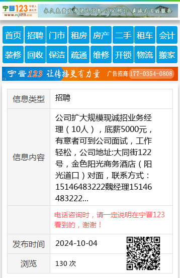 公司扩大规模现诚招业务经理(10人),底薪5000元,有意者可到公司面试,工作轻松,公司地址:大同街122号,金色阳光商务酒店(阳光道口)对面,联系方式:15146483222魏经理15146483222 【电话咨询时,请一定说明在七台河信息网看到的,谢谢!】 |