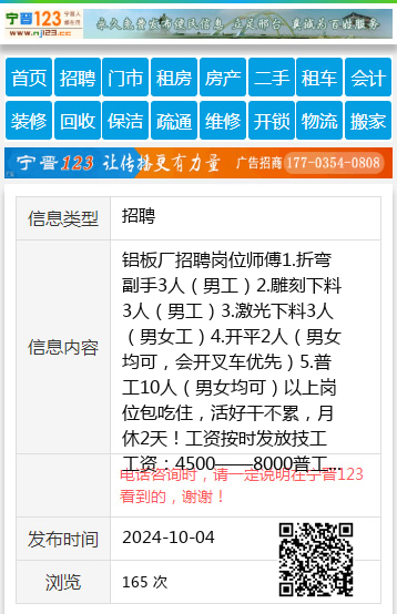 铝板厂招聘岗位师傅1.折弯副手3人(男工)2.雕刻下料3人(男工)3.激光下料3人(男女工)4.开平2人(男女均可,会开叉车优先)5.普工10人(男女均可)以上岗位包吃住,活好干不累,月休2天!工资按时发放技工工资:4500——8000普工工资:3800-450018—45周岁有无经验均可,男女不限,有经验者优先!联系人:王女士电话:13700346183王女士人18804640810 【电话咨询时,请一定说明在七台河信息网看到的,谢谢!】 |