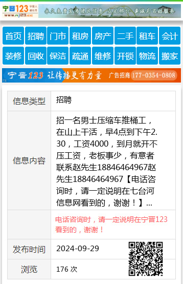 招一名男士压缩车推桶工,在山上干活,早4点到下午2.30,工资4000,到月就开不压工资,老板事少,有意者联系赵先生18846464967赵先生18846464967 【电话咨询时,请一定说明在七台河信息网看到的,谢谢!】 |