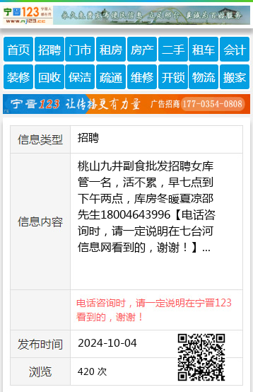 桃山九井副食批发招聘女库管一名,活不累,早七点到下午两点,库房冬暖夏凉邵先生18004643996