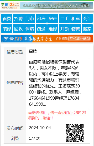 百威啤酒招聘餐饮销售代表3人,男女不限,年龄45岁以内,高中以上学历,有较强的沟通能力,有过市场销售经验的优先。工资底薪3000+提成。联系人:尹经理,17604641999尹经理17604641999 【电话咨询时,请一定说明在七台河信息网看到的,谢谢!】 |