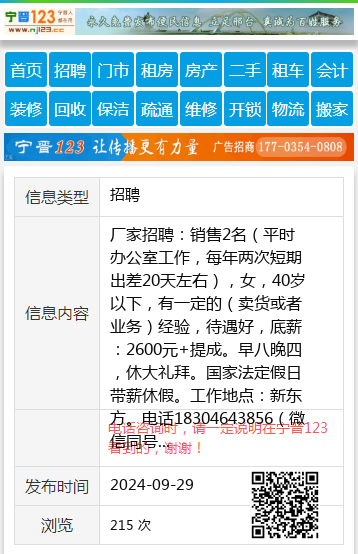 厂家招聘:销售2名(平时办公室工作,每年两次短期出差20天左右),女,40岁以下,有一定的(卖货或者业务)经验,待遇好,底薪:2600元+提成。早八晚四,休大礼拜。国家法定假日带薪休假。工作地点:新东方。电话18304643856(微信同号)孙先生18304643856 【电话咨询时,请一定说明在七台河信息网看到的,谢谢!】 |