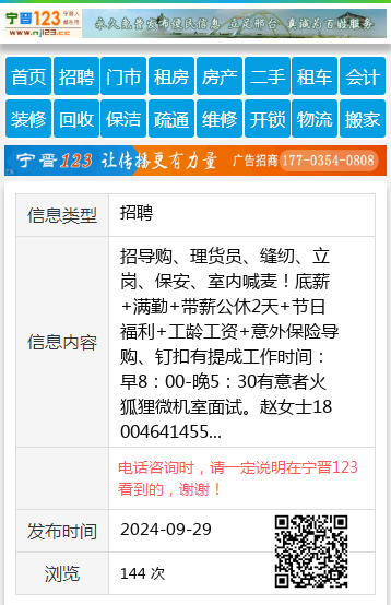 招导购、理货员、缝纫、立岗、保安、室内喊麦!底薪+满勤+带薪公休2天+节日福利+工龄工资+意外保险导购、钉扣有提成工作时间:早8:00-晚5:30有意者火狐狸微机室面试。赵女士18004641455 【电话咨询时,请一定说明在七台河信息网看到的,谢谢!】 |