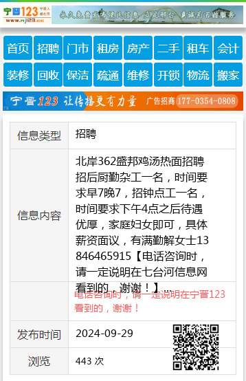 北岸362盛邦鸡汤热面招聘招后厨勤杂工一名,时间要求早7晚7,招钟点工一名,时间要求下午4点之后待遇优厚,家庭妇女即可,具体薪资面议,有满勤解女士13846465915 【电话咨询时,请一定说明在七台河信息网看到的,谢谢!】 |