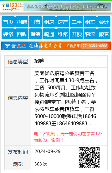 美团优选招聘分拣员若干名,工作时间早4.30-9点左右,工资1500每月。工作地址致远物流东院(桃山区顺路有车接)招聘带车司机若干名,要求微型车或者箱货车,工资5000-10000联系电话18646409883王18646409883 【电话咨询时,请一定说明在七台河信息网看到的,谢谢!】 |