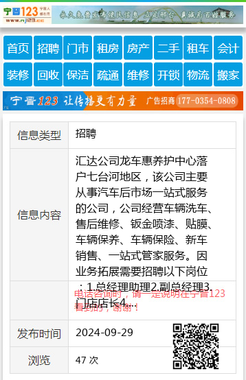 汇达公司龙车惠养护中心落户七台河地区,该公司主要从事汽车后市场一站式服务的公司,公司经营车辆洗车、售后维修、钣金喷漆、贴膜、车辆保养、车辆保险、新车销售、一站式管家服务。因业务拓展需要招聘以下岗位:1.总经理助理2.副总经理3.门店店长4.市场总监5.客服6.内勤、文员7.业务员8.洗车工9.后勤、杂工若干名以上岗位薪资待遇优厚,每月有带薪休假+午餐+社保+定期团建;有意者面谈地址:27路终点站原北京现代4S店候总19586392666 【电话咨询时,请一定说明在七台河信息网看到的,谢谢!】 |