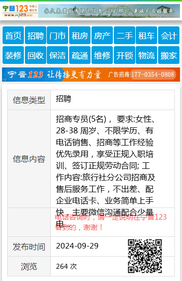 要求:女性、28-38 周岁、不限学历、有电话销售、招商等工作经验优先录用,享受正规入职培训、签订正规劳动合同;