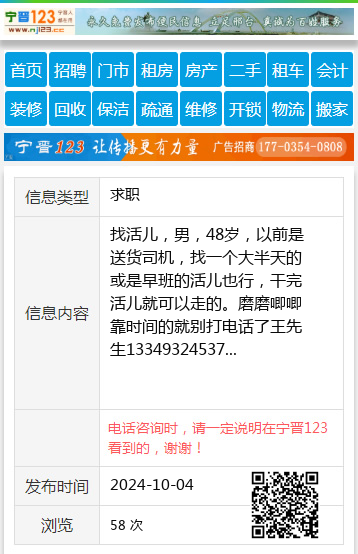 找活儿,男,48岁,以前是送货司机,找一个大半天的或是早班的活儿也行,干完活儿就可以走的。磨磨唧唧靠时间的就别打电话了王先生13349324537 【电话咨询时,请一定说明在七台河信息网看到的,谢谢!】 |