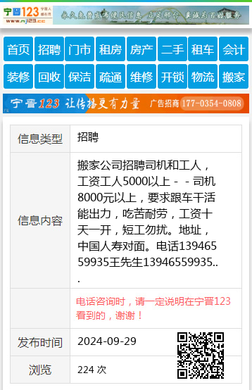 搬家公司招聘司机和工人,工资工人5000以上--司机8000元以上,要求跟车干活能出力,吃苦耐劳,工资十天一开,短工勿扰。地址,中国人寿对面。电话13946559935王先生13946559935 【电话咨询时,请一定说明在七台河信息网看到的,谢谢!】 |