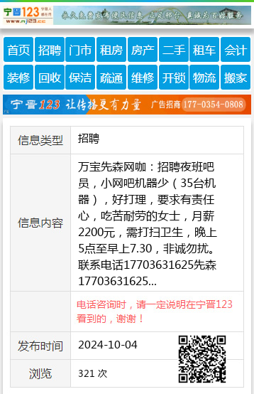 万宝先森网咖:招聘夜班吧员,小网吧机器少(35台机器),好打理,要求有责任心,吃苦耐劳的女士,月薪2200元,需打扫卫生,晚上5点至早上7.30,非诚勿扰。联系电话17703631625先森17703631625 【电话咨询时,请一定说明在七台河信息网看到的,谢谢!】 |
