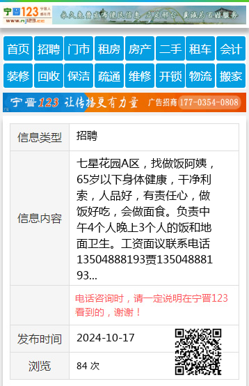 七星花园A区,找做饭阿姨,65岁以下身体健康,干净利索,人品好,有责任心,做饭好吃,会做面食。负责中午4个人晚上3个人的饭和地面卫生。工资面议联系电话13504888193贾13504888193 【电话咨询时,请一定说明在七台河信息网看到的,谢谢!】 |