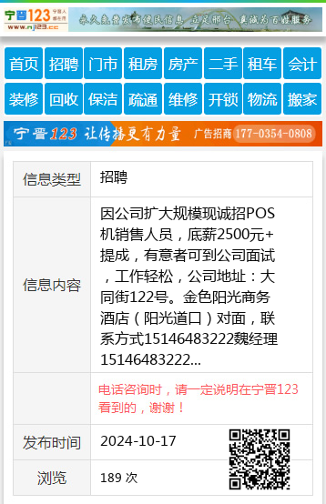 因公司扩大规模现诚招POS机销售人员,底薪2500元+提成,有意者可到公司面试,工作轻松,公司地址:大同街122号。金色阳光商务酒店(阳光道口)对面,联系方式15146483222魏经理15146483222 【电话咨询时,请一定说明在七台河信息网看到的,谢谢!】 |