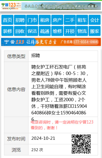 聘女护工矸石发电厂(林苑之星附近)早6:00-5:30,男老人78做中午饭照顾老人上卫生间能自理,有时糊涂看着别跌倒,需要有爱心文静女护工,工资2000,2个休,干好随着涨薪☎️15904640866钟女士15904640866 【电话咨询时,请一定说明在七台河信息网看到的,谢谢!】 |