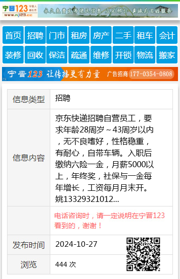 京东快递招聘自营员工,要求年龄28周岁~43周岁以内,无不良嗜好,性格稳重,有耐心,自带车辆。入职后缴纳六险一金,月薪5000以上,年终奖,社保与一金每年增长,工资每月月末开。姚13329321012 【电话咨询时,请一定说明在七台河信息网看到的,谢谢!】 |