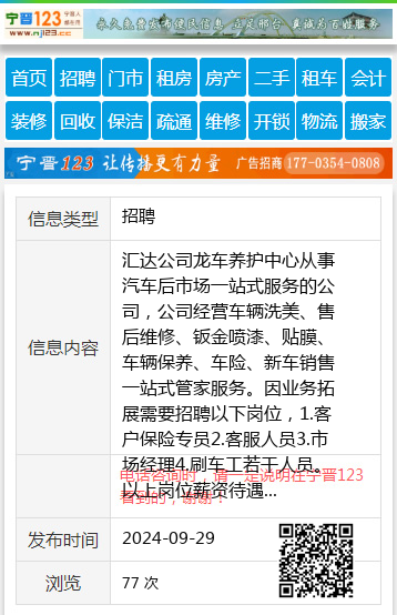 汇达公司龙车养护中心从事汽车后市场一站式服务的公司,公司经营车辆洗美、售后维修、钣金喷漆、贴膜、车辆保养、车险、新车销售一站式管家服务。因业务拓展需要招聘以下岗位,1.客户保险专员2.客服人员3.市场经理4.刷车工若干人员。以上岗位薪资待遇优厚,中午有食堂,定期团建。地址:27路终点站原北京现代4S店候总19586392666 【电话咨询时,请一定说明在七台河信息网看到的,谢谢!】 |