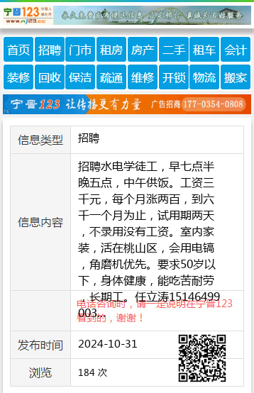 招聘水电学徒工,早七点半晚五点,中午供饭。工资三千元,每个月涨两百,到六千一个月为止,试用期两天,不录用没有工资。室内家装,活在桃山区,会用电镐,角磨机优先。要求50岁以下,身体健康,能吃苦耐劳,长期工。任立涛15146499003 【电话咨询时,请一定说明在七台河信息网看到的,谢谢!】 |