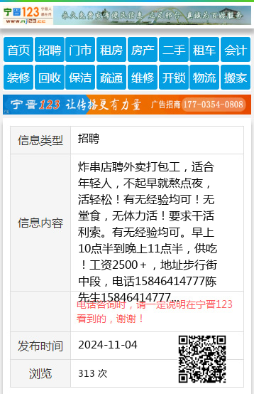 炸串店聘外卖打包工,适合年轻人,不起早就熬点夜,活轻松!有无经验均可!无堂食,无体力活!要求干活利索。有无经验均可。早上10点半到晚上11点半,供吃!工资2500+,地址步行街中段,电话15846414777陈先生15846414777 【电话咨询时,请一定说明在七台河信息网看到的,谢谢!】 |