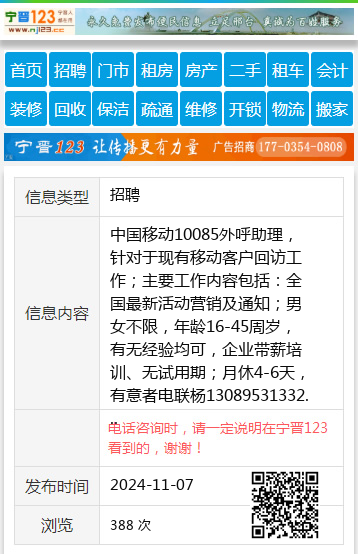 中国移动10085外呼助理,针对于现有移动客户回访工作;主要工作内容包括:全国最新活动营销及通知;男女不限,年龄16-45周岁,有无经验均可,企业带薪培训、无试用期;月休4-6天,有意者电联杨13089531332 【电话咨询时,请一定说明在七台河信息网看到的,谢谢!】 |