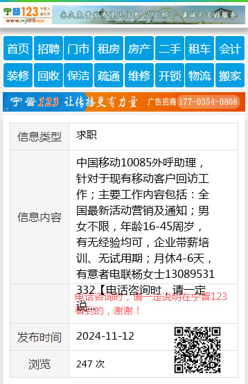 中国移动10085外呼助理,针对于现有移动客户回访工作;主要工作内容包括:全国最新活动营销及通知;男女不限,年龄16-45周岁,有无经验均可,企业带薪培训、无试用期;月休4-6天,有意者电联杨女士13089531332 【电话咨询时,请一定说明在七台河信息网看到的,谢谢!】 |