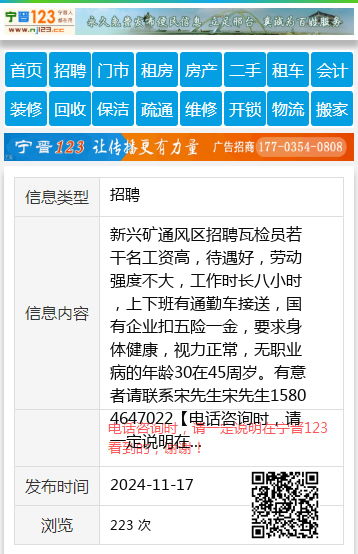 新兴矿通风区招聘瓦检员若干名工资高,待遇好,劳动强度不大,工作时长八小时,上下班有通勤车接送,国有企业扣五险一金,要求身体健康,视力正常,无职业病的年龄30在45周岁。有意者请联系宋先生宋先生15804647022 【电话咨询时,请一定说明在七台河信息网看到的,谢谢!】 |