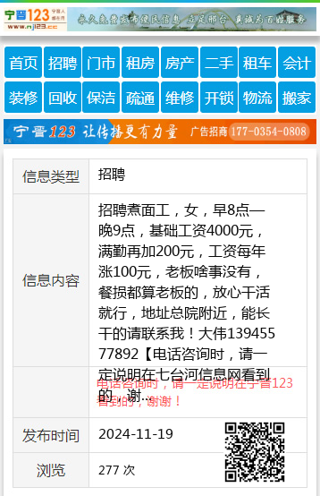 招聘煮面工,女,早8点—晚9点,基础工资4000元,满勤再加200元,工资每年涨100元,老板啥事没有,餐损都算老板的,放心干活就行,地址总院附近,能长干的请联系我!大伟13945577892 【电话咨询时,请一定说明在七台河信息网看到的,谢谢!】 |
