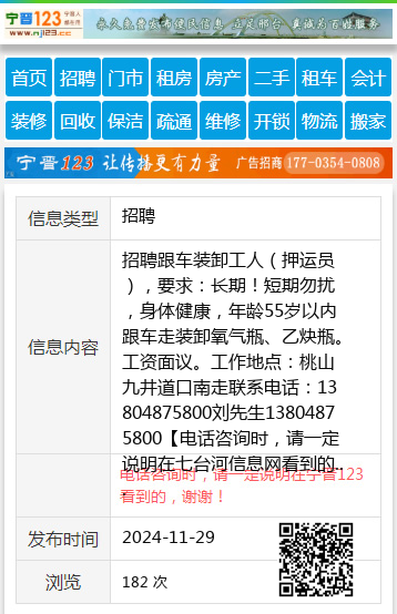招聘跟车装卸工人(押运员),要求:长期!短期勿扰,身体健康,年龄55岁以内跟车走装卸氧气瓶、乙炔瓶。工资面议。工作地点:桃山九井道口南走联系电话:13804875800刘先生13804875800 【电话咨询时,请一定说明在七台河信息网看到的,谢谢!】 |