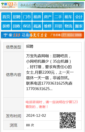 万宝先森网咖:招聘吧员,小网吧机器少(35台机器),好打理,要求有责任心的女士,月薪2200元,上一天一宿休一天一宿,非诚勿扰。联系电话17703631625先森17703631625 【电话咨询时,请一定说明在七台河信息网看到的,谢谢!】 |