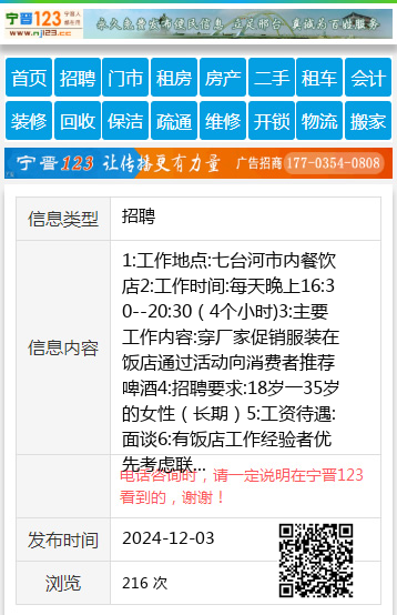 1:工作地点:七台河市内餐饮店2:工作时间:每天晚上16:30--20:30(4个小时)3:主要工作内容:穿厂家促销服装在饭店通过活动向消费者推荐啤酒4:招聘要求:18岁一35岁的女性(长期)5:工资待遇:面谈6:有饭店工作经验者优先考虑联系人:宋经理15636620777尹经理17604641999 【电话咨询时,请一定说明在七台河信息网看到的,谢谢!】 |