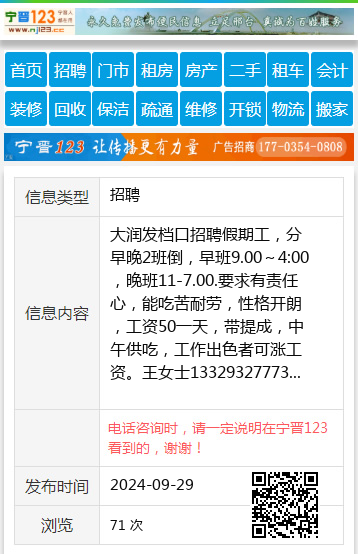 大润发档口招聘假期工,分早晚2班倒,早班9.00~4:00,晚班11-7.00.要求有责任心,能吃苦耐劳,性格开朗,工资50一天,带提成,中午供吃,工作出色者可涨工资。王女士13329327773 【电话咨询时,请一定说明在七台河信息网看到的,谢谢!】 |