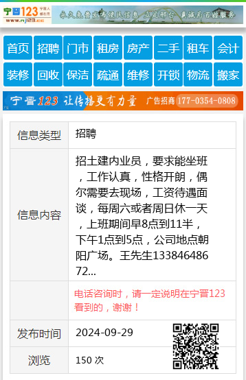 招土建内业员,要求能坐班,工作认真,性格开朗,偶尔需要去现场,工资待遇面谈,每周六或者周日休一天,上班期间早8点到11半,下午1点到5点,公司地点朝阳广场。王先生13384648672 【电话咨询时,请一定说明在七台河信息网看到的,谢谢!】 |