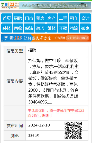 招保姆,做中午晚上两顿饭,擦灰。要求:干活麻利利索,真正年龄45到55之间,会做饭,做饭好吃,熟练做面食,性格好脾气柔顺,两休2000,节假日有休息,符合条件再联系,非诚勿扰语18304646961 【电话咨询时,请一定说明在七台河信息网看到的,谢谢!】 |