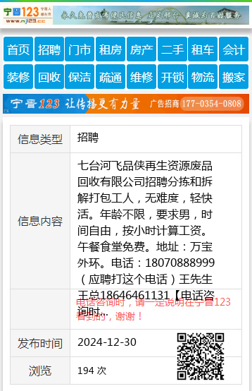 七台河飞品侠再生资源废品回收有限公司招聘分拣和拆解打包工人,无难度,轻快活。年龄不限,要求男,时间自由,按小时计算工资。午餐食堂免费。地址:万宝外环。电话:18070888999(应聘打这个电话)王先生王总18646461131 【电话咨询时,请一定说明在七台河信息网看到的,谢谢!】 |