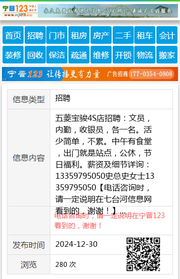 五菱宝骏4S店招聘:文员,内勤,收银员,各一名。活少简单,不累。中午有食堂,出门就是站点,公休,节日福利。薪资及细节详询:13359795050史总史女士13359795050 【电话咨询时,请一定说明在七台河信息网看到的,谢谢!】 |