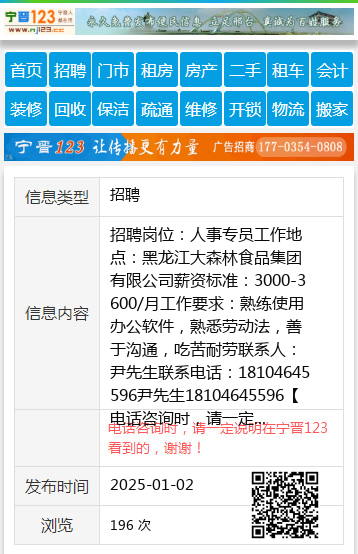 招聘岗位:人事专员工作地点:黑龙江大森林食品集团有限公司薪资标准:3000-3600/月工作要求:熟练使用办公软件,熟悉劳动法,善于沟通,吃苦耐劳联系人:尹先生联系电话:18104645596尹先生18104645596 【电话咨询时,请一定说明在七台河信息网看到的,谢谢!】 |