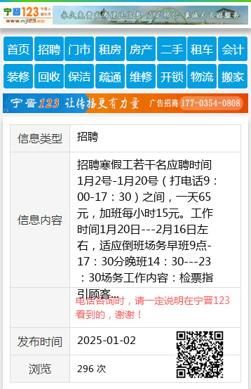招聘寒假工若干名应聘时间1月2号-1月20号(打电话9:00-17:30)之间,一天65元,加班每小时15元。工作时间1月20日---2月16日左右,适应倒班场务早班9点-17:30分晚班14:30---23:30场务工作内容:检票指引顾客进厅散厅捡厅倒垃圾负责影院各处卫生,服从领导安排听指挥。前台早班9点-17:30分晚班13:30--进场配餐卖票办卡蹦爆米花擦爆米花机器打扫影城卫生。星感觉15145699595 【电话咨询时,请一定说明在七台河信息网看到的,谢谢!】 |
