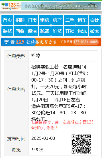 招聘寒假工若干名应聘时间1月2号-1月20号(打电话9:00-17:30)之间,过点别打。一天70元,加班每小时15元。三天试用期工作时间1月20日---2月16日左右,适应倒班场务早班9点-17:30分晚班14:30---23:30场务工作内容:检票指引顾客进厅散厅捡厅倒垃圾负责影院各处卫生,服从领导安排听指挥。前台早班9点-17:30分晚班13:30--进场配餐卖票办卡蹦爆米花擦爆米花机器打扫影城卫生星感觉15145699595 【电话咨询时,请一定说明在七台河信息网看到的,谢谢!】 |