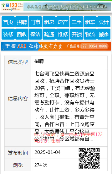 七台河飞品侠再生资源废品回收,招聘合作回收员骑士20名,工资日结,有无经验均可,全职、兼职均可,无需考勤打卡,没有车提供电动车,计件工资,多劳多得,收入高门槛低,有晋升空间。合作内容:上门收购废品,大数据线上平台接单,公平排单,分区域都有自己的片区,工作地点七台河市区内。月薪6000元—10000+元上不封顶。详情请拨打18646461131(微信同步)废品免费上门回收热线:0464-292833315214649666一斤废品也上门!称准!不缺斤少两!飞品侠18646461131 【电话咨询时,请一定说明在七台河信息网看到的,谢谢!】 |
