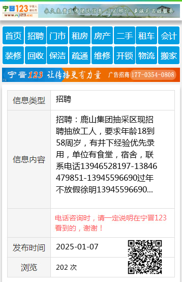 招聘:鹿山集团抽采区现招聘抽放工人,要求年龄18到58周岁,有井下经验优先录用,单位有食堂,宿舍,联系电话13946528197-13846479851-13945596690过年不放假徐明13945596690 【电话咨询时,请一定说明在七台河信息网看到的,谢谢!】 |