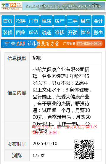 芯龄美健康产业有限公司招聘一名业务经理1.年龄在45岁以下,男女不限;2.高中以上文化水平;3.身体健康,品行端正,热爱大健康产业,有干事业的热情。薪资待遇:试用期一个月,月薪3000元,合格录用后,月薪5000元以上。工作一年后,公司缴纳五险一金。工作地址:桃山区东北亚楼下。联系电话:17345637687卢先生18145418883 【电话咨询时,请一定说明在七台河信息网看到的,谢谢!】 |
