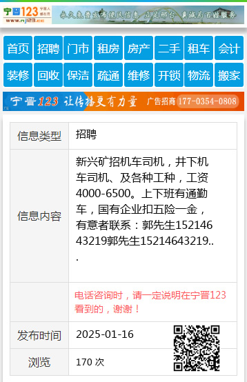 新兴矿招机车司机,井下机车司机、及各种工种,工资4000-6500。上下班有通勤车,国有企业扣五险一金,有意者联系:郭先生15214643219郭先生15214643219 【电话咨询时,请一定说明在七台河信息网看到的,谢谢!】 |