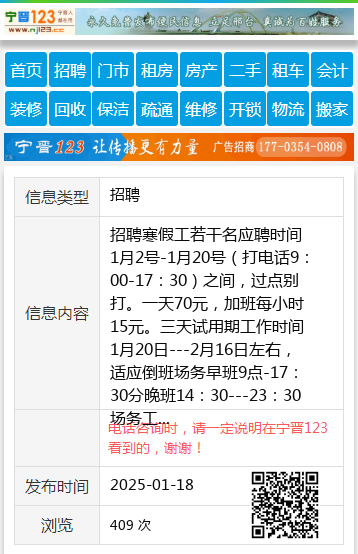 招聘寒假工若干名应聘时间1月2号-1月20号(打电话9:00-17:30)之间,过点别打。一天70元,加班每小时15元。三天试用期工作时间1月20日---2月16日左右,适应倒班场务早班9点-17:30分晚班14:30---23:30场务工作内容:检票指引顾客进厅散厅捡厅倒垃圾负责影院各处卫生,服从领导安排听指挥。前台早班9点-17:30分晚班13:30--进场配餐卖票办卡蹦爆米花擦爆米花机器打扫影城卫生星感觉15145699595 【电话咨询时,请一定说明在七台河信息网看到的,谢谢!】 |